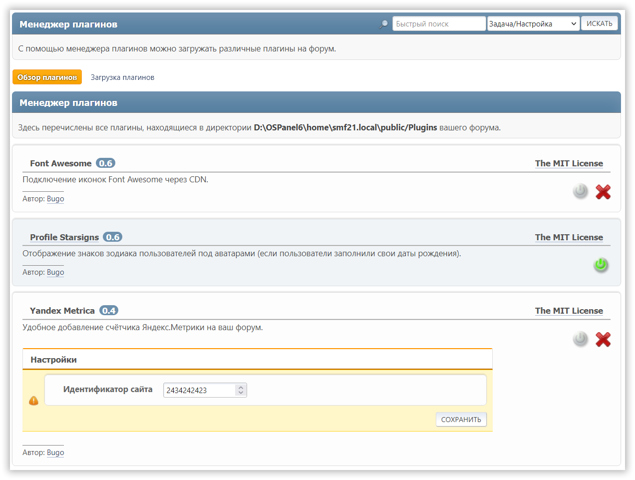 <database>, он выполняется при включении плагина. - При выключении плагина имя его директории удаляется из $plugins в Settings.php. Файлы плагина на диске остаются, поэтому его можно включить снова позже.
