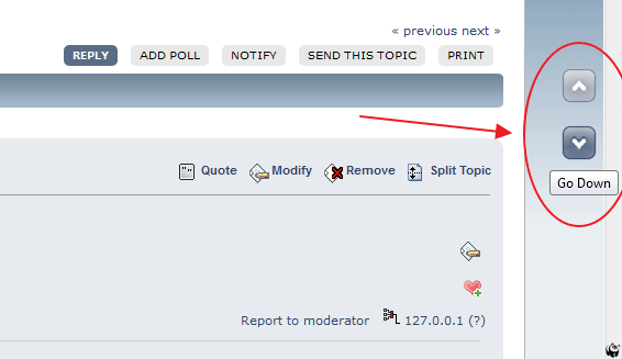 Модификация добавляет кнопки «Вверх/Вниз» в темах форума. Кнопки прокрутки необходимы на сайтах, где публикуются длинные и массивные записи. На форумах в темах с большим количеством сообщений такой мод пригодится. Это экономит время, пользователям нет нужды нудно прокручивать всю страницу вручную.